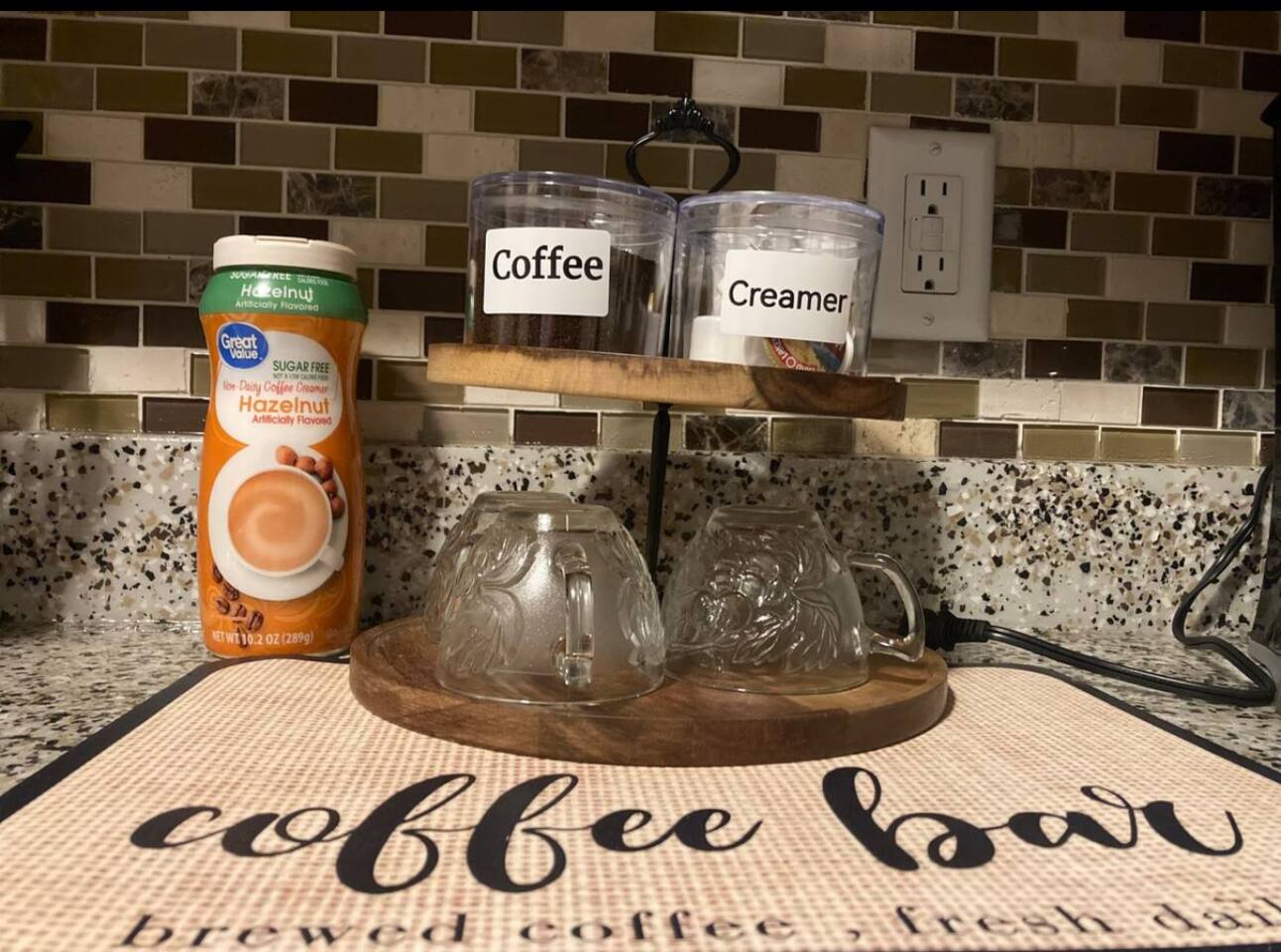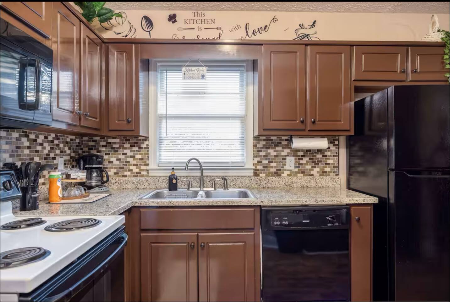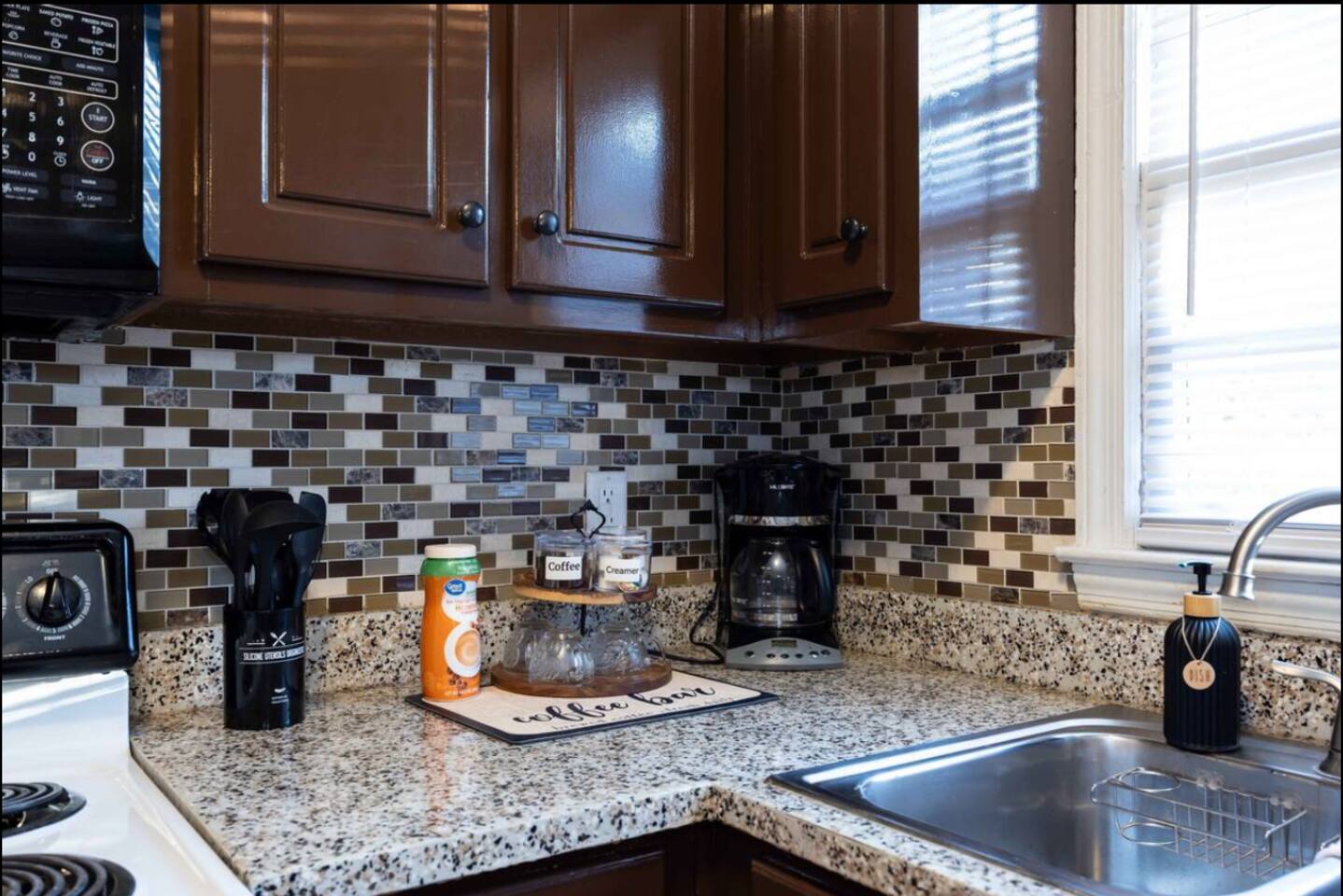 - Fully Stocked Kitchen: Coffee bar includes drip coffee maker, coffee filter, traditional roast coffee, creamer and sugar; kid’s plate/eating set, adult dishware, spoons and knives, wine glasses, non-stick baking ware set, microwave, pots and pans, waffle maker, toaster, and blender