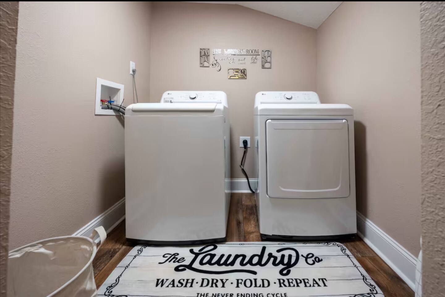 - Laundry Room: LG Washer & Dryer, Iron, Ironing board, laundry detergent pods